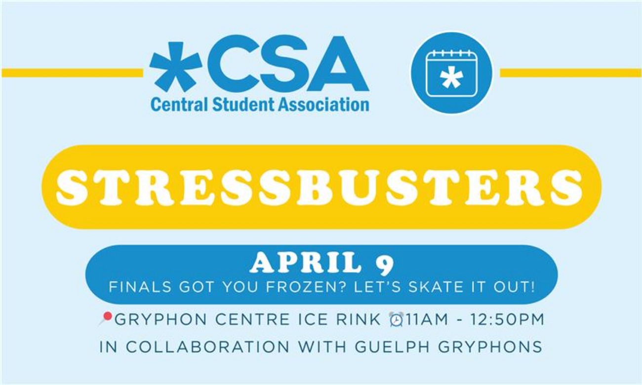 Join your CSA and Gryphon Athletics & Recreation for a free skate at the Gryphon Centre Arena – Gold Rink. Limited FREE skate rentals available (first come, first served), plus FREE hot chocolate & cookies!