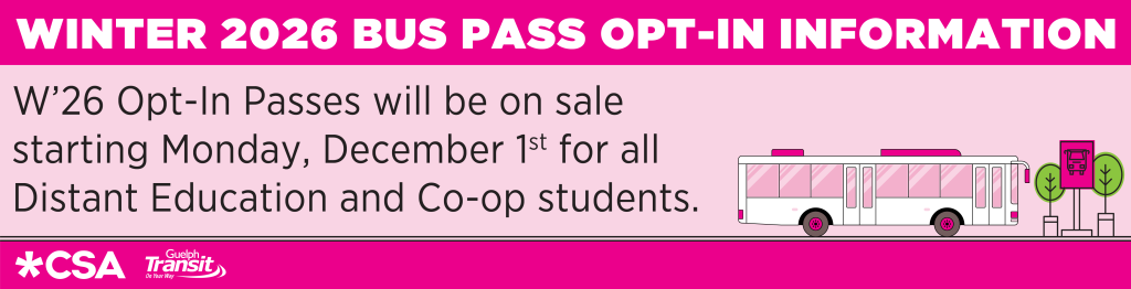 If you are a UofG student enrolled in designated Distance Education courses in W’26, or are on a Co-op work term in W’26, you are eligible to purchase a fall bus pass. The pass is a pre-loaded OnYourWay card, activated from January 1st – April 30th, and available only from the CSA.