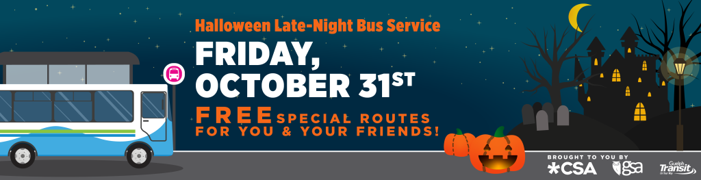 In partnership with the Central Students Association and the Graduate Student Association, we’re excited to announce that we are offering an enhanced late night service on Friday, October 31st! Get home safe this Halloween Gryphons!🎃